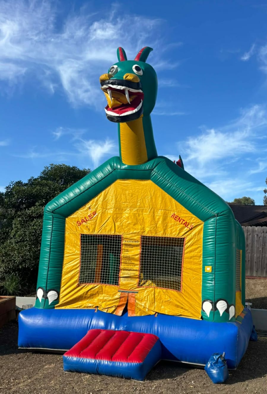 Stomp into party mode with our awesome Dino Bouncer! This eye-catching inflatable features a giant dinosaur head on top and bright, bold colors that make it the centerpiece of any event.